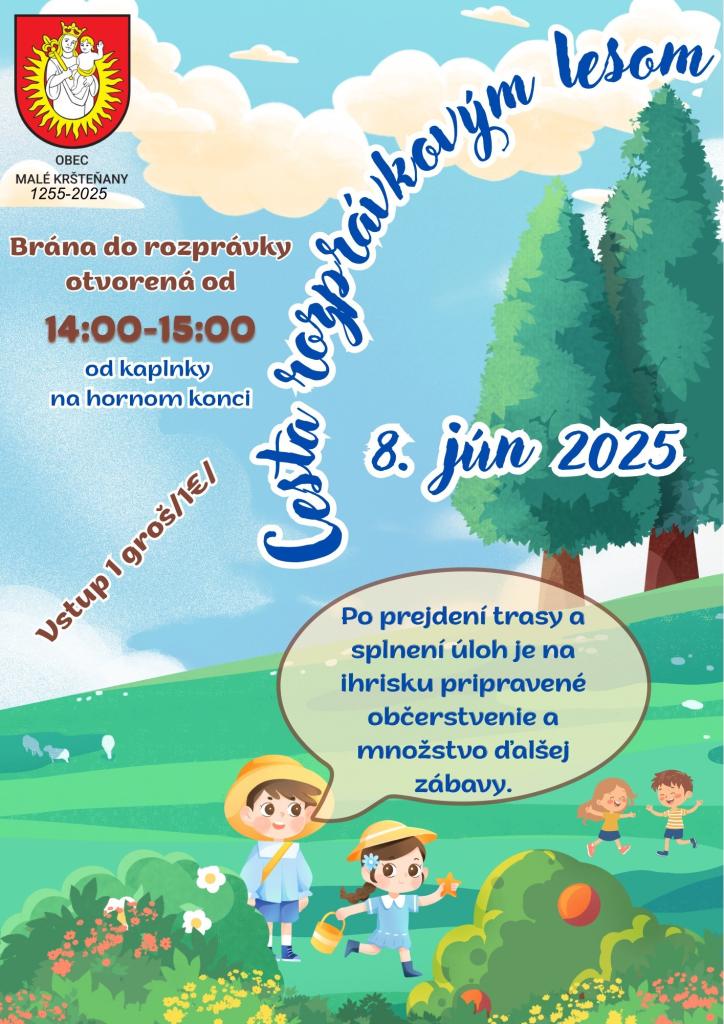 Obec Malé Kršteňany vás srdečne pozýva na podujatie "Cesta rozprávkovým lesom", ktoré sa uskutoční 8. júna 2025. Po splnení úloh na trase čaká na deti občerstvenie a zábava na ihrisku.